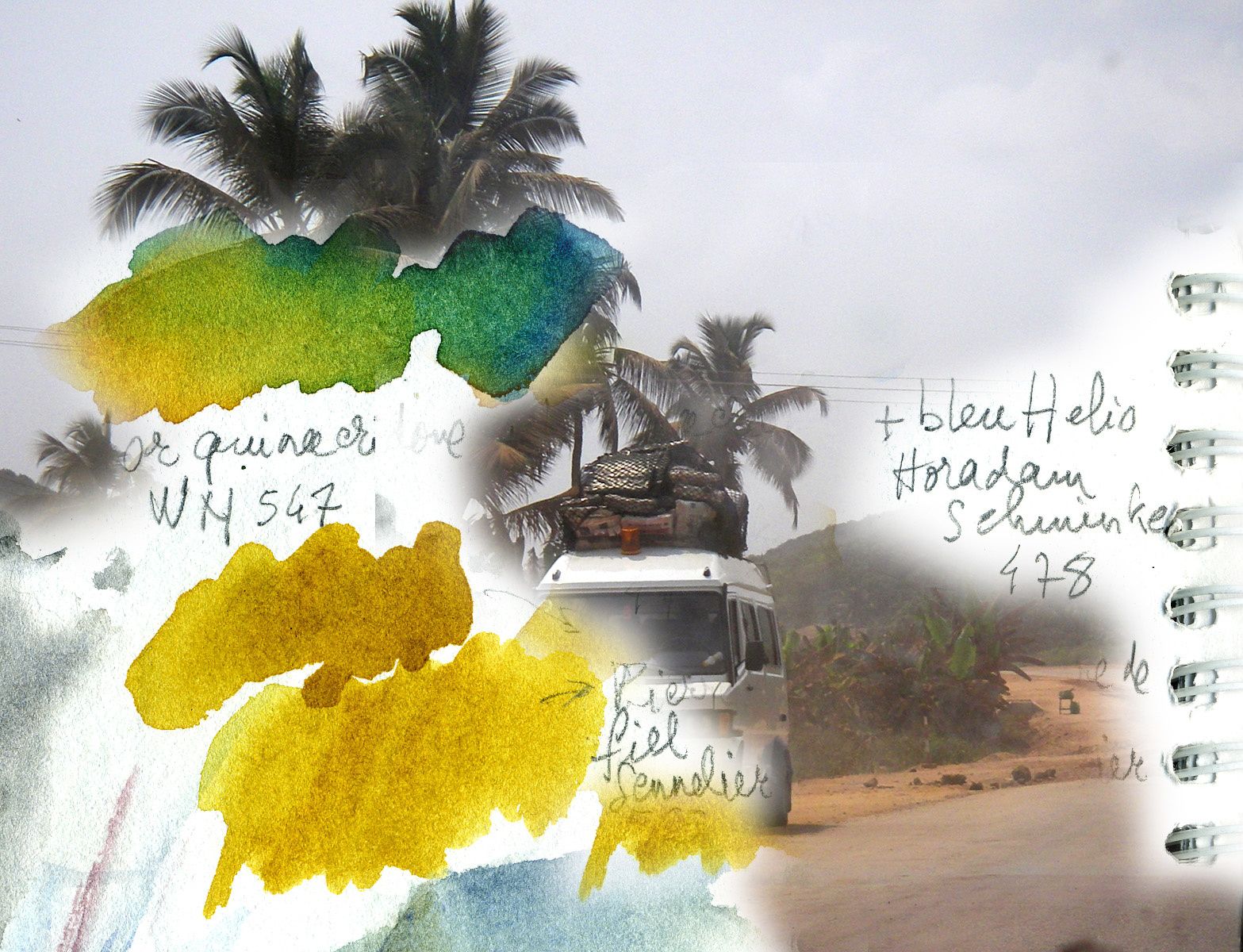 Sans doute avez-vous suivi mes différents billets sur les réseaux sociaux et mon blog « Aquarelle-en-voyage.com », avez-vous écouté mes enregistrements, visionné le beau film de Jean ROUCH dans mon dernier article ? Si oui, avec la publication des aquarelles qui les accompagnaient, vous avez pu vous plonger avec moi dans l’atmosphère totalement exotique des lieux et ambiances où je vous emmenais pour vous faire découvrir le début de mon voyage… Mais ce que vous ne savez pas, c’est la route extraordinaire que les circonstances et rencontres allaient me faire suivre à partir des rivages du golfe de Guinée : une route au cœur même de l’ingéniosité et de la beauté africaine, un itinéraire qui allait surtout s’affirmer comme celui des plus forts symboles liés à la transmutation des êtres et des choses !
